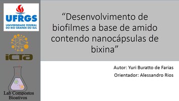 Trabalho com o objetivo de caracterizar e traçar os perfis de biofilmes com base a amido contendo nanocápsulas de bixina de 0, 2, 5, 8, e 10%. Análises como solubilidade, permeabilidade a vapor de água, tração e alongamento e opacidade trazem como resultado um perfil ideal para embalagens biodegradaveis os biofilmes de 8 e 10%.