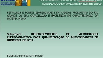 00201271. (05/09/2014). Desenvolvimento de metodologia eletroanalítica para quantificação de antioxidantes em biodiesel de soja. Recuperado 28/01/2026, de Finova 2014 Web site(s): http://videos.ufrgs.br/finova2014/desenvolvimento-de-metodologia-eletroanalitica-para-quantificacao-de-antioxidantes-em-biodiesel-de-soja.