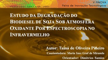 O objetivo principal deste trabalho é estudar as mudanças observadas no biodiesel de soja metílico comercial sem adição de antioxidante, quando submetido à atmosfera oxidante de ar sintético, em diferentes condições de temperatura e tempo de aquecimento.
