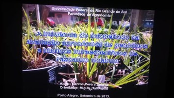 O gênero Paspalum, incluindo suas diversas espécies forrageiras, possui papel fundamental predominante na fisionomia e na participação da produção pecuária dos campos nativos do Bioma Pampa. Dentre as espécies, destaca-se Paspalum notatum Flügge, pois apresenta boa qualidade de forragem e alta persistência ao pastejo e ao pisoteio dos animais (Pozzobon & Valls, 1997). Além disso, a existência de inúmeros genótipos adaptados as mais variadas condições de solo e clima tem despertado o interesse da pesquisa, no intuito de selecionar os superiores para o lançamento como cultivar. No entanto, a sua produção concentra-se no período de verão, ocorrendo uma drástica queda produtiva no período de inverno, sendo esta determinada pela dormência que é induzida pela redução do fotoperíodo (Dall’Agnol & Gomes, 1987). As baixas temperaturas ocorridas nesta estação do ano também acabam influenciando de maneira negativa o acúmulo de forragem e conseqüentemente a sua produção estacional. Desta forma, este trabalho foi conduzido com o objetivo de determinar a produção de matéria seca e avaliar a resposta de genótipos superiores de P. notatum submetidos à influência do fotoperíodo. Foram avaliados genótipos tetraplóides de Paspalum notatum provenientes do Departamento de Agricultura dos Estados Unidos (USDA) (30N, 36N, 48N, 70N, 83N, 95N,V4), da Universidade Nacional do Nordeste da Argentina (Q4188, Q4205 e C44X), além de híbridos intraespecíficos de P. notatum resultantes de cruzamentos realizados entre Q4205 - utilizada como progenitora feminina- e André da Rocha e Bagual - utilizados como progenitores masculinos-, totalizando seis híbridos superiores selecionados para produção de matéria seca (PMS) em trabalho conduzido anteriormente (Weiller, 2013): C1, C2, C15, C17 – Q4205 x André da Rocha (Progênie “C”) e D3 e D16 – Q4205 x Bagual (Progênie “D”). O nível de ploidia destes genótipos foi descrito por Facchineto (2010), Quarin (1984) e Weiller (2013), respectivamente. Utilizou-se como testemunhas a cv. Pensacola e mais dois genótipos nativos de P. notatum do Rio Grande do Sul, André da Rocha e Bagual, totalizando 19 genótipos. Com exceção dos genótipos Q4188, Q4205 e C44X, os demais que foram avaliados neste trabalho passaram por processos de seleção para produção de matéria seca em trabalhos anteriores (Steiner, 2005; Fachinetto, 2010). Foram feitos cinco clones de cada genótipo mantidos em vasos de 2,8 L, alocados em área aberta, onde foram submetidos ao ambiente com fotoperíodo natural e fotoperíodo estendido (15 horas de luz). O delineamento experimental utilizado foi inteiramente casualizado em esquema fatorial 19 x 2 (genótipos x fotoperíodo), com fotoperíodo natural e estendido, constituído de cinco repetições. A produção de forragem dos genótipos foi avaliada por meio de cortes realizados durante os meses de julho de 2011 a outubro de 2012. Para os genótipos prostrados e cespitosos as alturas dos resíduos foram correspondentes a cinco e 10 cm, respectivamente. Os materiais coletados foram colocados para secar em estufa com ar forçado a 55 ºC por 72 horas e posteriormente foram pesados. Considerou-se 5% de significância. Como resultado encontrou-se interação genótipo x fotoperíodo (P<0,05) e genótipo x fotoperíodo x estação do ano (P<0,05) para produção de matéria seca total (g.vaso-1 ). Ficou evidenciado que o manejo utilizado trouxe consequências distintas para os genótipos testados. A maior parte dos genótipos demonstrou ser afetada pelo tratamento imposto (fotoperíodo estendido e fotoperíodo natural) gerando consequências nas produções de matéria seca total para as estações de primavera e verão.