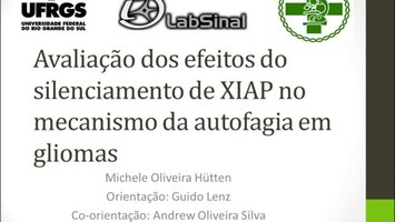 Introdução: Gliomas são os tipos mais comuns de tumores primários no sistema nervoso central, sendo o Glioblastoma (GBM) a forma mais agressiva e mortífera, com alta resistência tanto a quimio quanto radioterapia. Um importante fator que contribui à resistência é a superexpressão de XIAP (X-linked Inhibitor of Apoptosis), proteína que bloqueia apoptose por inibir diretamente as caspases 3, 7 e 9. Autofagia é um mecanismo fisiológico de degradação e reciclagem de componentes celulares que, em cânceres, pode atuar como supressor tumoral, levando à morte autofágica, ou pode auxiliar as células tumorais a sobreviver sob condições adversas. A autofagia é um processo que se relaciona com a apoptose, pois as vias de sinalização de ambos os mecanismos interagem em vários pontos através de proteínas. Dessa forma, torna-se importante avaliar como o silenciamento de XIAP modula o processo autofágico em linhagens de glioma humano. Resultados: Células de glioma humano das linhagens U373 e A172 foram silenciadas por transdução lentiviral de RNA de interferência (RNAi) para XIAP (sequência X6 ou X8) e foi usado como controle de transfecção RNA de interferência do gene da proteína fluorescente verde (GFP). Tal método, por ser um procedimento de biossegurança de nível 2, foi realizado pelo doutorando Andrew Oliveira Silva. Esse trabalho foi realizado por mim como projeto de trabalho de conclusão de curso de biomedicina, portanto as etapas seguintes foram de minha responsabilidade. A partir do ensaio de population doubling constatou-se que, para ambas as linhagens utilizadas, o silenciamento de XIAP, tanto a sequência X6 quanto a X8, não foi capaz de alterar a taxa de proliferação celular em relação ao controle selvagem e em relação ao controle de transfecção. Na análise de autofagia por marcação com laranja de acridina foi constatado que, nas células silenciadas (X6 e X8), os níveis de autofagia estavam aumentados. Perspectivas: Ensaios de LC3-GFP serão feitos para que seja obtida mais uma confirmação sobre autofagia. A análise molecular da indução da autofagia será feita pelo ensaio de Western Blotting e será traçada uma relação autofagia x apoptose através da marcação com iodeto de propídeo e anexina V.