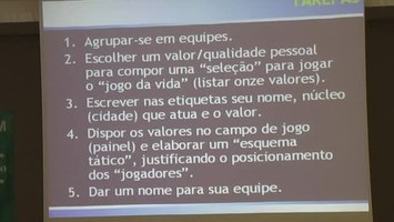 Vídeos exibindo atividades da capacitação, tais como: mesa de abertura, palestras e oficinas. As atividades contaram com a presença de Agrio Chacon, Amauri de Oliveira, Clarice Teixeira, João Liparoti, Fernando Marques, Ferrucio Feitosa, Fernando Marques, João Liparoti, Leandro Rechenchoski, Ruth Cidade, Lisiane Torres, Fabiano de Souza Fonseca, entre outros. As atividades contemplam apresentações de palestras e dinâmicas em grupo.