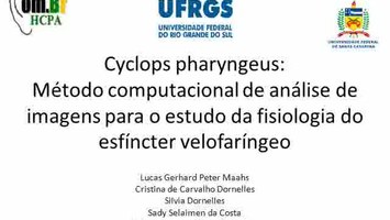Objetivo: Demonstrar a aplicabilidade do software Cyclops Pharyngeus no estudo da fisiologia do esfíncter velofaríngeo. Materiais e Métodos: confecção de um vídeo-documentário pela captura de imagens do tipo slide, explicando a evolução do projeto Cyclops em um primeiro momento, seguido de uma breve explanação sobre o funcionamento do esfíncter velofaríngeo. Ainda, serão explicados os materiais e métodos utilizados na aplicação do software e demonstrados os resultados obtidos, exemplificando-se, assim, a contribuição do programa. Por fim, algumas considerações serão feitas. Roteiro: O primeiro slide mostra o título e acompanha uma explicação sobre a origem do projeto: o Cyclops é um projeto multicêntrico desenvolvido em uma parceria entre a disciplina de Otorrinolaringologia da Faculdade de Medicina da Universidade Federal do Rio Grande do Sul (FAMED-UFRGS) e o Laboratório de Processamento de Imagens e Computação Gráfica da Universidade Federal de Santa Catarina (LAPIX-UFSC). O segundo slide é sobre o Cyclops Auris, fruto do projeto na área da otologia, com o objetivo de desenvolver um sistema computacional que permita mensurar a proporção entre as áreas timpânicas afetadas e o remanescente do tímpano íntegro por meio da análise de videotoscopias digitais. O terceiro slide explica a origem do Cyclops Pharyngeus: a enorme aplicação do Auris levou à sua expansão a outras áreas da otorrinolaringologia. O esfíncter velofaríngeo (EVF) é uma área de convergência das três subdivisões da otorrinolaringologia, sendo natural a aplicação do software para o estudo da sua fisiologia. O quarto slide mostra o esfíncter velofaríngeo , que é uma cinta muscular entre a orofaringe e a nasofaringe, e os músculos que o compõem. O quinto slide explica a alternância entre via respiratória e via digestiva da faringe, a cada deglutição, mantida pelo EVF. O fechamento do esfíncter é fundamental para atividades motoras como a fala, o assobio, o sopro, a sucção e a deglutição. O sexto slide mostra os 2 padrões de fechamento do EVF encontrados: pneumático (envolve fluxo aéreo, como a fala e o sopro) e não-pneumático (não envolve fluxo aéreo, como a deglutição). O sétimo e o oitavo slide dizem respeito aos objetivos do Cyclops Pharyngeus, criado por adaptação do Cyclops Auris com o objetivo de melhorar o entendimento da fisiologia do EVF, por meio de uma análise quantitativa dos percentuais de movimentação de 4 diferentes momentos de ação do mecanismo velofaríngeo (dois nãopneumáticos, repouso e deglutição, e dois pneumáticos, sopro e fonema /s/), e correlacionar os achados entre os momentos de ação e entre grupos com e sem alterações anatomofuncionais do EVF. No nono slide, são mostrados os materiais e métodos usados na aplicação do software: videonasofaringoscopias de dois grupos de pacientes, sendo mostrada uma de exemplo. Os slides dez e onze mostram os grupos de estudo: de controle (55 sujeitos entre 6 e 65 anos, sem queixas relacionadas ao EVF, alterações anatomopatológicas documentadas ou histórico de cirurgia sobre o EVF, comparecendo a consultas agendadas não-emergenciais no Serviço de Otorrinolaringologia do Hospital Universitário da Universidade Luterana do Brasil no segundo semestre de 2008) e de casos (45 sujeitos entre 6 e 12 anos portadores de fissura labiopalatina ou palatina isolada, já submetidos a palatoplastia e em acompanhamento no Ambulatório de Otorrinolaringologia e Fissura Palatina do HCPA entre fevereiro de 2005 e dezembro de 2008). No décimo segundo slide, será incluído o programa em ação, para exemplificar de modo consistente o método pelo qual as videonasofaringoscopias foram submetidas para análise no Cyclops Pharyngeus. Ao fim, foram obtidas oito imagens por paciente, duas de cada momento referido, sendo uma delas com os dados da análise. O slide treze mostra dados dos grupos: Dos 55 indíviduos do grupo controle, 34 eram mulheres. A média de idade foi 36 anos e 2 meses. Dos 45 do grupo de casos, 33 eram homens. A média de idade foi de 9 anos e 4 meses. Os slides catorze e quinze apresentam tabelas e suas interpretações: o eixo horizontal mostrou-se com percentual menor de ação que o eixo vertical para quase todas as ações motoras solicitadas em ambos os grupos (tabela 1) e o grupo controle apresenta percentual de movimentação maior nos dois eixos, para todas as ações realizadas, quando comparado ao grupo de casos (tabela 2). O slide dezesseis mostra um gráfico e sua interpretação: a ação motora de deglutição apresenta percentual de fechamento no eixo antero-posterior, maior que nas demais ações motoras no grupo de casos. O décimo sétimo slide mostra considerações finais: o Cyclops Pharyngeus, assim como o Cyclops Auris, aumentou o poder estatístico do trabalho, proporcionando uma análise objetiva da fisiologia do EVF. Mostra-se, assim, uma valiosa ferramenta para um melhor entendimento desta região anatômica.