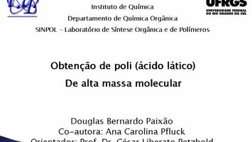 Em meio ao crescimento da indústria de plásticos, surgem preocupações com o meio ambiente e com os materiais que os compõem: os polímeros. O Poli(ácido lático), o PLA, é um polímero biodegradável e renovável, sendo cada vez mais estudado por pesquisadores para uma melhor utilização na indústria de plásticos. Neste trabalho, será apresentado um método de obtenção de PLA através de uma reação de policondensação utilizando líquidos iônicos como solventes da reação, tendo como objetivo principal altas massas moleculares. Os líquidos iônicos são compostos formados por cátions orgânicos e ânions orgânicos ou inorgânicos, que apresentam temperatura de fusão abaixo de 100ºC. Estes líquidos têm sido empregados na catálise, na eletroquímica, e como substituintes dos solventes orgânicos tradicionais, sendo amplamente empregados na síntese orgânica e em processos de polimerização. Foram utilizados os líquidos iônicos [BMIM] [Cl] e [BMIM][BF4] nas reações de policondensação, partindo-se de um pré-polímero de baixa massa molecular. O resultado obtido foi um polímero de alta massa molecular. Ao término do vídeo, serão discutidas medidas e mudanças nos parâmetros reacionais relacionados à pressão, temperatura, e aos líquido iônicos utilizados, através de tabelas que mostram a massa molecular e o rendimento obtidos em diferentes valores e escalas dos parâmetros anteriormente citados. Para o futuro, será utilizado o líquido iônico [BMIM] [Ac] no processo de policondensação, visando uma maior massa molecular de PLA.