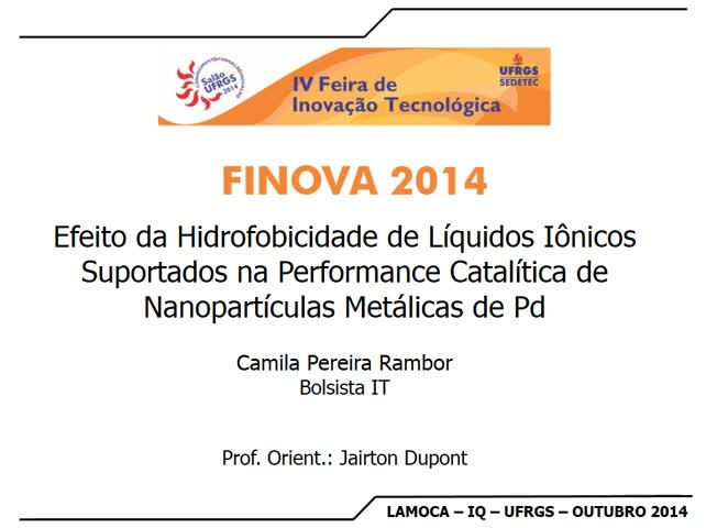 00160158. (23/09/2014). Efeito da Hidrofobicidade de Líquidos Iônicos Suportados na Performance Catalítica de Nanopartículas Metálicas de Pd. Recuperado 06/12/2025, de Finova 2014 Web site(s): https://videos.ufrgs.br/finova2014/efeito-da-hidrofobicidade-de-liquidos-ionicos-suportados-na-performance-catalitica-de-nanoparticulas-metalicas-de-pd.