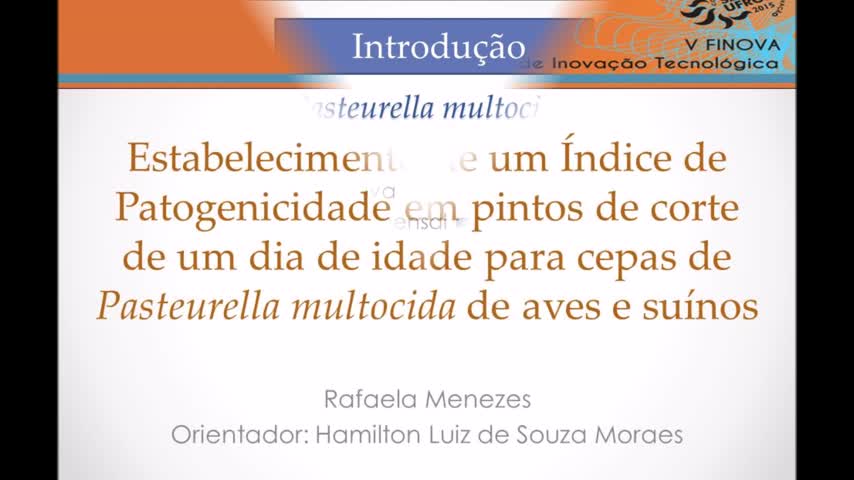 Vídeo para apresentação na FINOVA 2015. “Estabelecimento de um Índice de Patogenicidade em pintos de corte de um dia de idade para cepas de Pasteurella multocida de aves e suínos". Orientador: Hamilton Luiz de Souza Moraes Bolsista: Rafaela Menezes
