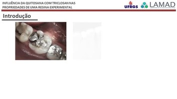 O objetivo deste estudo foi avaliar a incorporação de quitosana com triclosan em uma resina adesiva experimental e avaliar suas propriedades físico-químicas. Uma resina adesiva experimental foi formulada proporcionando 66% de Bis-GMA e 33% de HEMA. Foram adicionados 1% de Canforoquinona e 1% de EDAB, em mol, em todos os grupos. A formulação de quitosana com triclosan foi realizada na proporção 1:1, utilizando acetona como solvente. Para a confecção dos grupos foram adicionados à resina adesiva 2% ou 5%, em peso, de quitosana com triclosan e confeccionado um grupo controle para cada ensaio sem a incorporação da quitosana com triclosan. Os materiais experimentais foram caracterizados quanto ao grau de conversão (GC) com micro Raman, à dureza Knoop (10g por 10s), à distribuição das partículas no adesivo por micro Raman e a radiopacidade. Os dados foram analisados por ANOVA de uma via e Tukey, quando necessário, com nível de significância de 5%. Os valores de grau de conversão variaram de 84,12% a 85,78%, sem diferença estatisticamente significativa (p>0,05). Quanto à dureza, os valores variaram de 22,14 a 24,96. O grupo com 5% apresentou dureza semelhante ao grupo controle (p>0,05), enquanto o grupo 2% apresentou menor dureza que ambos os grupos (p<0,05). Foi possível perceber a distribuição homogênea das partículas de quitosana com triclosan na resina adesiva polimerizada e os valores de radiopacidade foram de 11,69 no grupo 0%, 12,27 no grupo 2% e 12,56 no grupo 5%, não apresentando diferença estatística significativa. A adição de 5% de quitosana com triclosan não alterou as características avaliadas.
