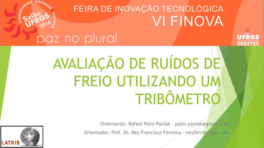 00242158. (12/06/2017). Avaliação de ruídos de freio utilizando um tribômetro. Recuperado 08/12/2025, de Finova 2016 Web site(s): https://videos.ufrgs.br/finova2016/avaliacao-de-ruidos-de-freio-utilizando-um-tribometro.