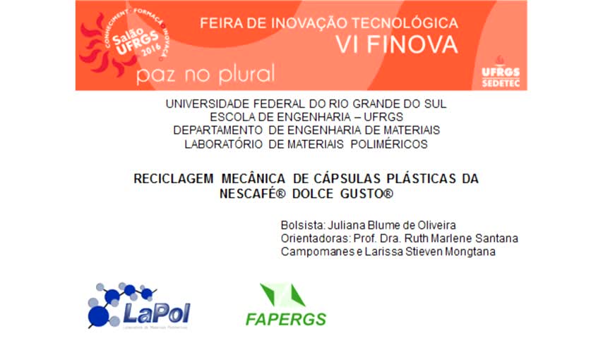 00242158. (07/06/2017). Reciclagem mecânica de cápsulas plásticas da NESCAFÉ® DOLCE GUSTO®. Recuperado 08/12/2025, de Finova 2016 Web site(s): https://videos.ufrgs.br/finova2016/reciclagem-mecanica-de-capsulas-plasticas-da-nescafe-r-dolce-gusto-r.
