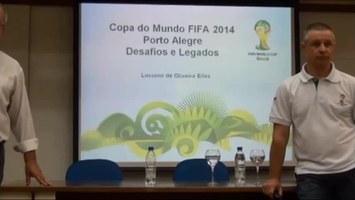 Palestra "Copa do Mundo na cidade de Porto Alegre: Desafios e Legados" ministrada por Luciano de Oliveira Elias. Foi promovida por: Grupo de Estudos em Esportes, Grupo de Estudos e Pesquisa no Futebol, Centro de Estudos Olímpicos e Centro de Memória do Esporte.